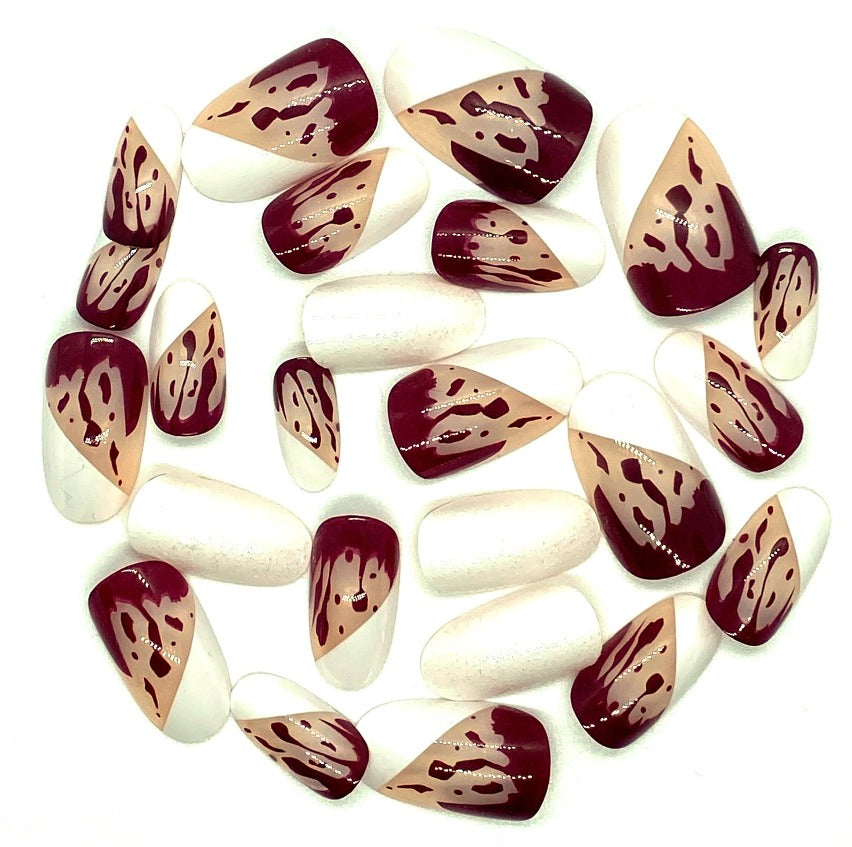 These wicked nails have a clearish base dripping with blood, and an angled white tip. This set also includes iridescent white accent nails.