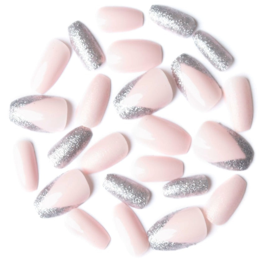 These nails are everything pretty. They are a soft pink with glittery tips and glittery accent nails.