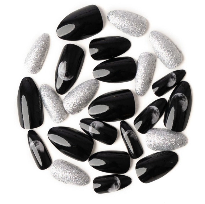 These spacey nails are a glossy black with silver glittered accents, and cool moon graphics.