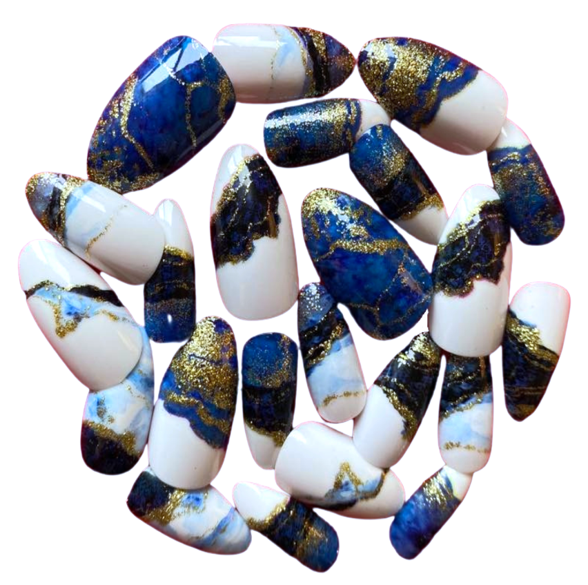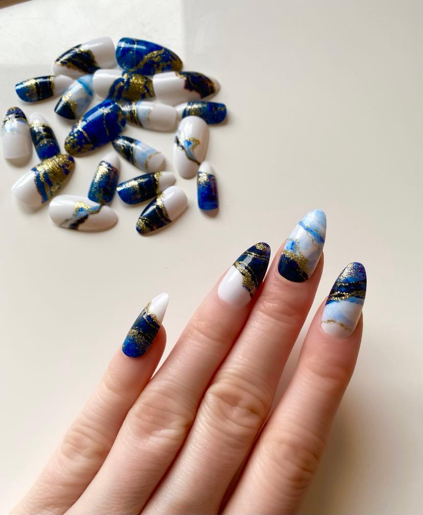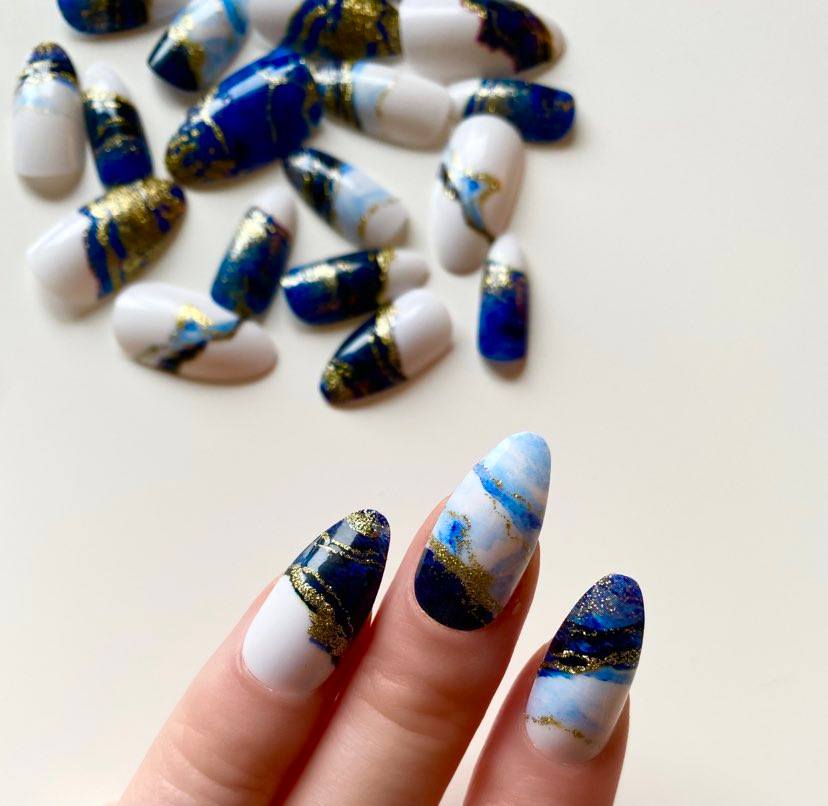 These nails have a white base with intricate blue marbling and streaks of gold glitter. They look like treasure sparkling beneath the ocean waves.