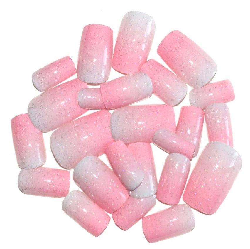 These nails are purple/gray at the base and transition to pink at the tips. They're also littered with sparkles!