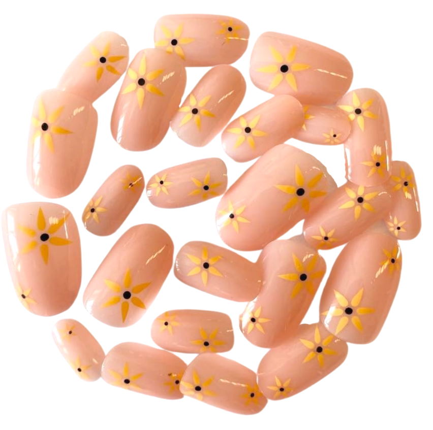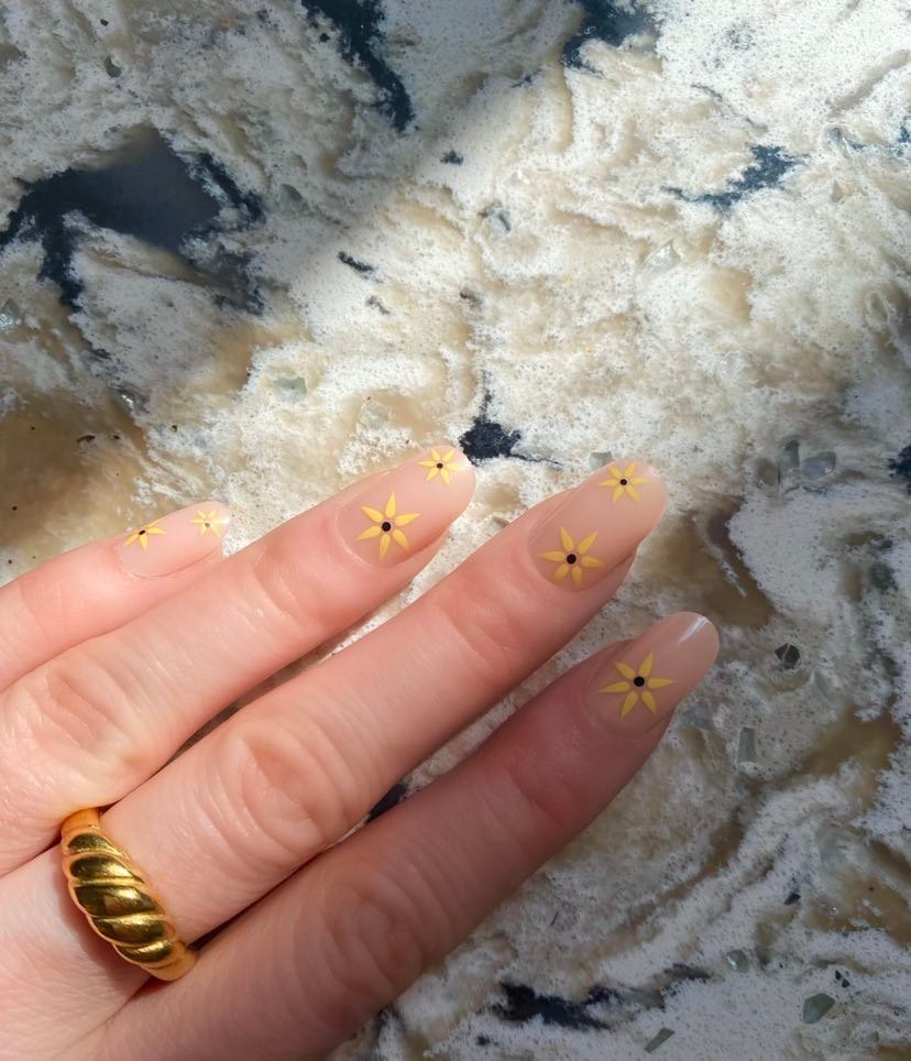 With their pink-nude base and pretty sunflowers, these sunny nails will brighten up any room or mood.