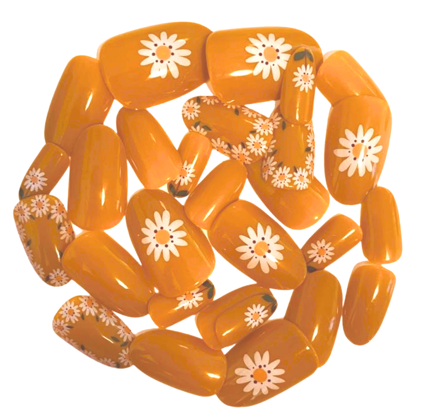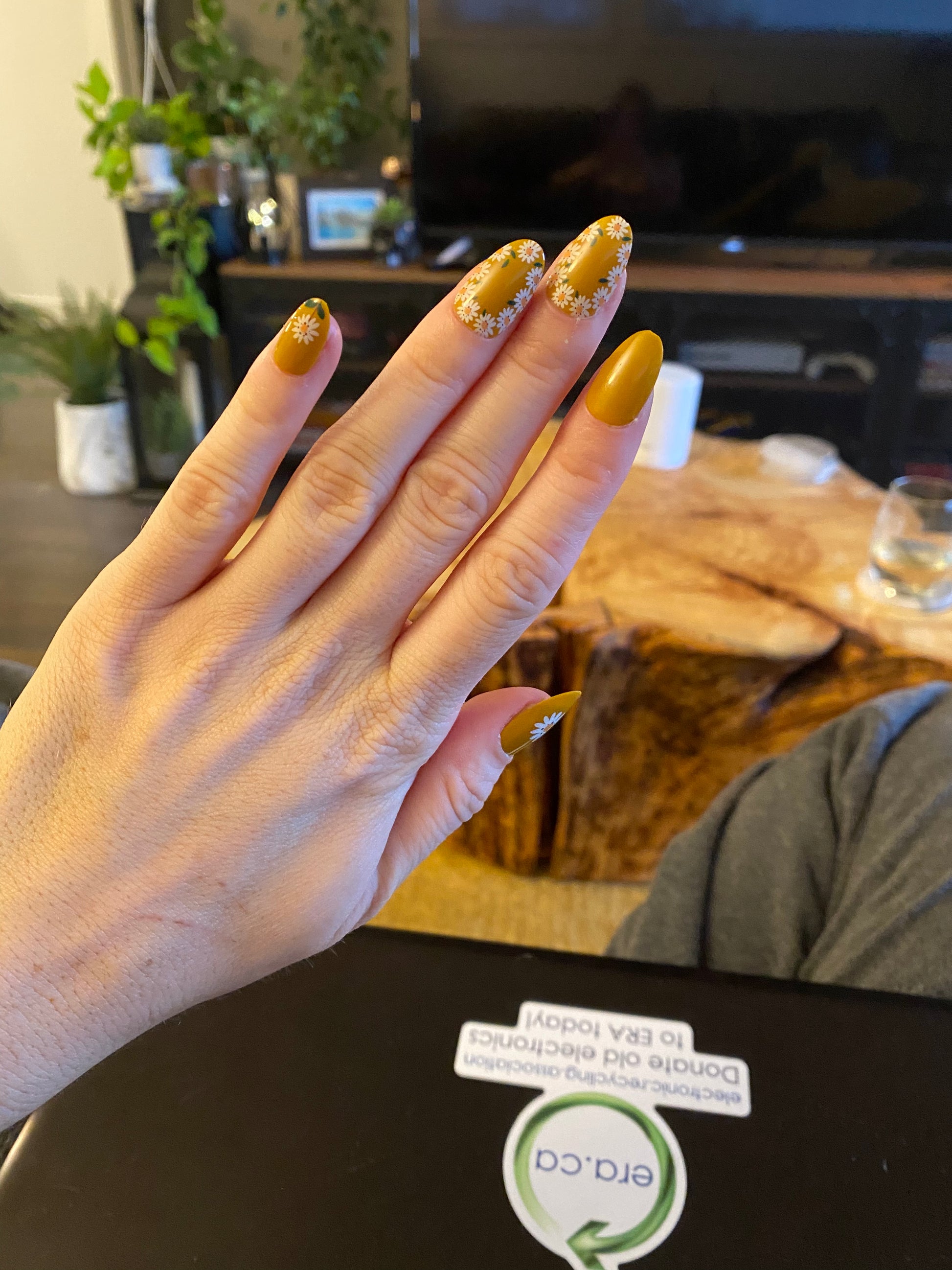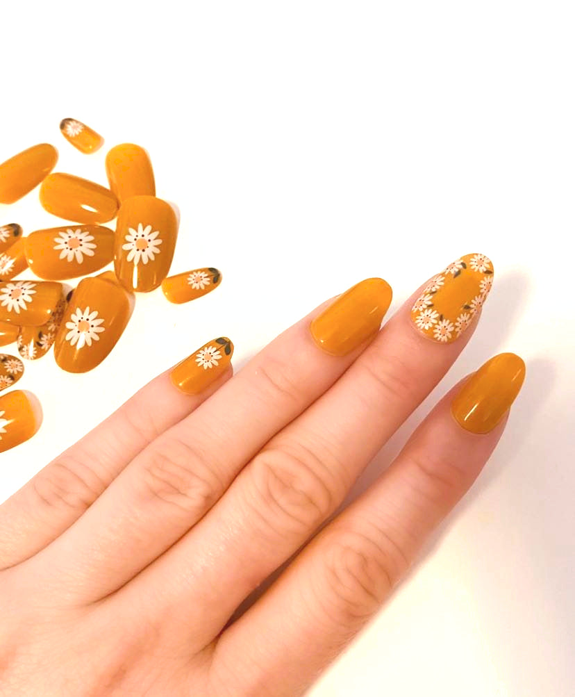 These earthy, butterscotch-coloured nails with their daisy pattern will have you feeling wild and free. This colour is very in right now!